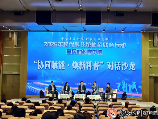 活动现场。广西科技馆供图 主场活动精彩汇集,全年各主题科普活动承办科技馆以舞台艺术为载体,联袂展示各月活动亮点特色,以创新科普形式共同打造“全民的科学中心”。在“协同赋能・焕新科普”对话沙龙环节中,不同领域的专家学者围绕现代科技馆体系跨界协同创新机制、资源赋能路径等维度分享实践经验,为现代科技馆体系高质量发展提供了宝贵思路。在科普资源成果展示区,来自现代科技馆体系近20家省(自治区、直辖市)、市、县科技馆,集中展示科技创新成果、优质科普展品、教具、资源包等,积极推动科研设施开放共享,为全国场馆搭建经验交流平台。